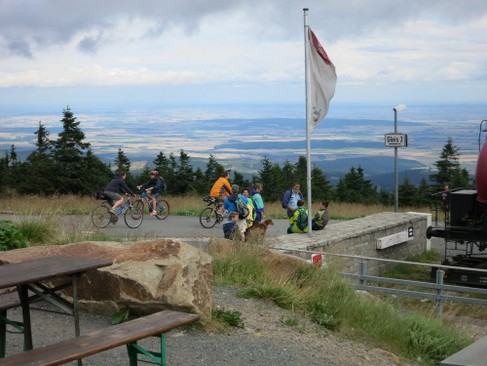 Endlich auf dem Brockenplateau angekommen, ist unser erstes Ziel der höchste Gipfelpunkt, um ein Erinnerungsfoto zu erstellen. Obwohl zur Zeit nur wenige Besucher auf dem Gipfel sind, hat sich bereits eine kleine Warteschlange am begehrten Fotomotiv gebildet. Der jeweils nachfolgend Wartende wird zum Fotografieren animiert, der den Job meist bereitwillig übernimmt. Dann sind wir endlich an der Reihe und hoffen, dass trotz der bescheidenen Lichtverhältnisse, die uns die dicke, schwarze Wolkendecke beschert, noch brauchbare Fotos entstehen. Während wir im Schutze des Waldes vom heftigen Wind verschont blieben, ist er jetzt deutlich spürbar und entwickelt zeitweise Sturmböen. Wir schießen noch einige Fotos von dem beeindruckenden Landschaftspanorama. Es ist heute sehr diesig und die Sicht reicht nicht besonders weit, dennoch ist die beeindruckende Höhe - jedenfalls für uns Norddeutsche - noch gut wahrzunehmen. Im Anschluss geht es weiter zum Imbiss „Hexenklause“ und wir löschen beide unseren Durst mit einem alkoholfreien Weizenbier, schließlich müssen wir nach der Anstrengung wieder Flüssigkeit aufnehmen und Wasser hatten wir aus unseren Trinkflaschen genug genossen. Schutz vor Wind und Regen finden wir unter dem Dachvorsprung eines nah gelegenen Holzschuppens. Hier können wir auf einer rustikalen Holzbank Platz nehmen, die aus einem längs durchgesägten Baumstamm besteht. Während unserer Pause genießen wir die Sicht auf die vielen vorbeiziehenden Besucher, die auf dem letzten Stück der Brockenstraße auf- oder absteigen. Manchen fällt es sichtbar genauso schwer wie mir, andere bewältigen die Strecke offenbar mühelos.