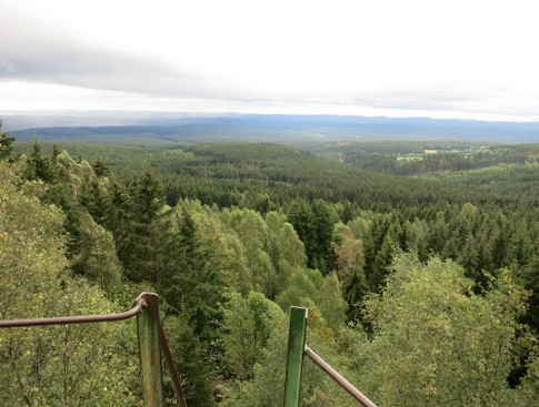 Wieder ein wenig zu Kräften gekommen, begeben wir uns auf die Abfahrt. Dabei bremsen wir in Intervallen, um die Bremsklötze nicht heißlaufen zu lassen. Mittlerweile ist die Straße mit Berggästen gefüllt und wir müssen vorsichtig an ihnen vorbeifahren, um nicht mit einem Kleinkind oder freilaufenden Hund zu kollidieren. Mehrmals fährt mit hoher Geschwindigkeit eine Gruppe Mountainbike-Fahrer an uns vorbei, zum Glück passiert durch ihr rücksichtsloses Verhalten kein Unfall. Einige Kilometer später erreichen wir eine Gabelung, an der wir zur Fortsetzung unserer Route links abbiegen. Damit verlassen wir auch die asphaltierte Straße und fahren auf einen schmalen Schotterweg. Wir bewegen uns langsam, weil die relativ großen Schottersteine keinen festen Untergrund bilden und unsere Laufräder etwas hin- und herschubsen. Doch mit ein wenig Balancieren ist die Fahrt kein Problem. Hoffentlich hält unsere Bereifung den scharfen Gesteinskanten stand. Auch auf diesem Abschnitt werden wir mehrfach von schnell fahrenden Mountainbike-Fahrern überholt. Zum Glück befinden sich auf dieser Strecke nur wenige Fußgänger, die gut ausweichen können. Auch diese Strecke führt uns wieder durch den Brockenwald. Ein Stück werden wir von einem romantisch kleinen Bachlauf begleitet. Das wenige Licht, dass der dichte Wald durchlässt, bricht sich zwischen den Zweigen und lässt alles in einem lieblichen Ambiente erscheinen. Die konzentrierte Abfahrt lässt uns die schöne Umgebung mit nur wenigen Blicken würdigen. Zum Aussichtspunkt Trudenstein sind es noch 700 m, kündigt uns ein Hinweisschilder an. Als wir dem Aussichtspunkt näherkommen, müssen wir trotzdem langsam fahren, da er etwas versteckt zwischen Bäumen liegt. Der Aussichtspunkt Trudenstein besteht aus großen aufeinandergetürmten Granitfelsen. An ihnen sind Metallleitern und Geländer angebracht, die einem sicher den Aufstieg zum obersten Punkt ermöglichen. Oben angekommen bietet sich uns ein weiter, schöner Blick über die Harzlandschaft. Die Fernsicht ist von hier aus sogar besser als vom Brockengipfel. Ähnlich den Stempelstellen am Jakobsweg wurde auf hier eine Stelle eingerichtet. Offensichtlich bringt es den Gästen Spaß, die Besichtigungsstationen in einem Pass zu sammeln. Ich mache mir einen Druck zur Erinnerung auf ein Stück Papier und fotografiere die imposante Gesteinsformation.